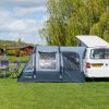 El toldo también tiene una entrada lateral de esclusa con puerta de malla, dos ventanas laterales y ventilación continua.El material exterior HydraDore de alta calidad y ligero con equipo UV cumple con todos los requisitos de un toldo ligero.
