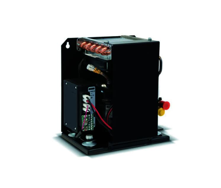 Unidades de refrigeraciónLas unidades de refrigeración se utilizan para fabricar compartimentos refrigerados de hasta 300 litros y compartimentos congeladores de hasta 100 litros.Todas las unidades disponen de alimentación, como estándar, 12/24 V CC y se suministran sin refrigerante en el circuito.Bajo pedido, pueden equiparse con acoplamientos rápidos y fuente de alimentación adicional a 100/240 V CA. Dependiendo del tipo de sistema de refrigeración, la fuente de alimentación CA se puede proporcionar por una unidad de control electrónica (12-24 / 100-240 VCA 50/60 Hz) aplicada al compresor o por una fuentede alimentación de conmutación automática externa.