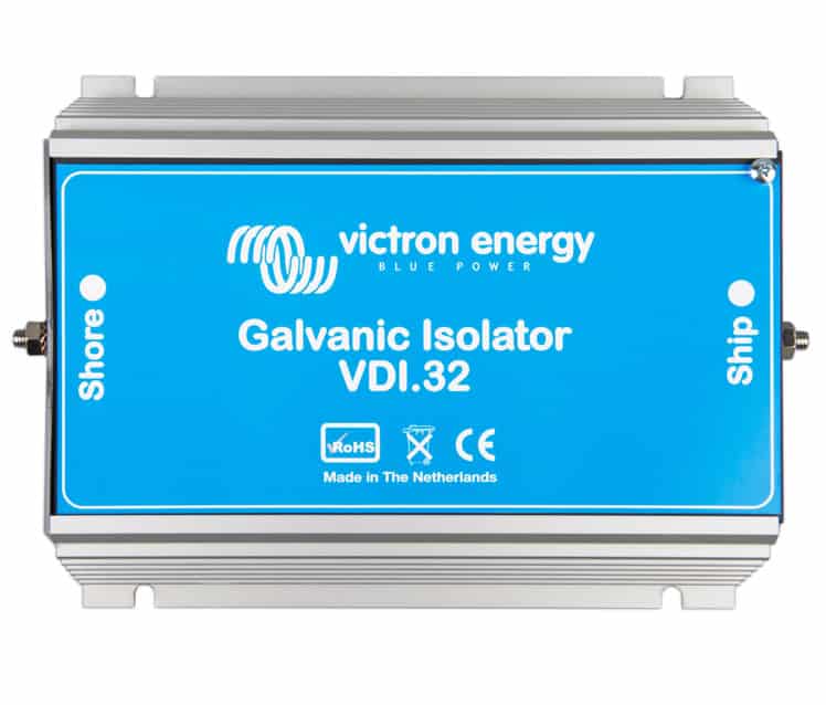 El aislador galvánico está compuesto internamente por dos diodos conectados en antiparalelo. Cuando están conectados de este modo, los diodos permiten la circulación de corriente en ambas direcciones, pero sólo por encima de un determinado umbral de tensión. La tensión a la que conducen los diodos es de aproximadamente 1,4 Vcc. El aislador se instala directamente detrás de la conexión de 230 V de su barco. La tensión de avance del aislador galvánico es superior a la diferencia de potencial entre metales. Como resultado, este voltaje no permitirá la conducción y como tal, el aislador galvánico evitará cualquier corriente electrolítica. Sin embargo, si hay una tensión de error (más alta) en el circuito de CA, los diodos permitirán el paso de la corriente y el dispositivo de corriente residual interrumpirá el circuito.
