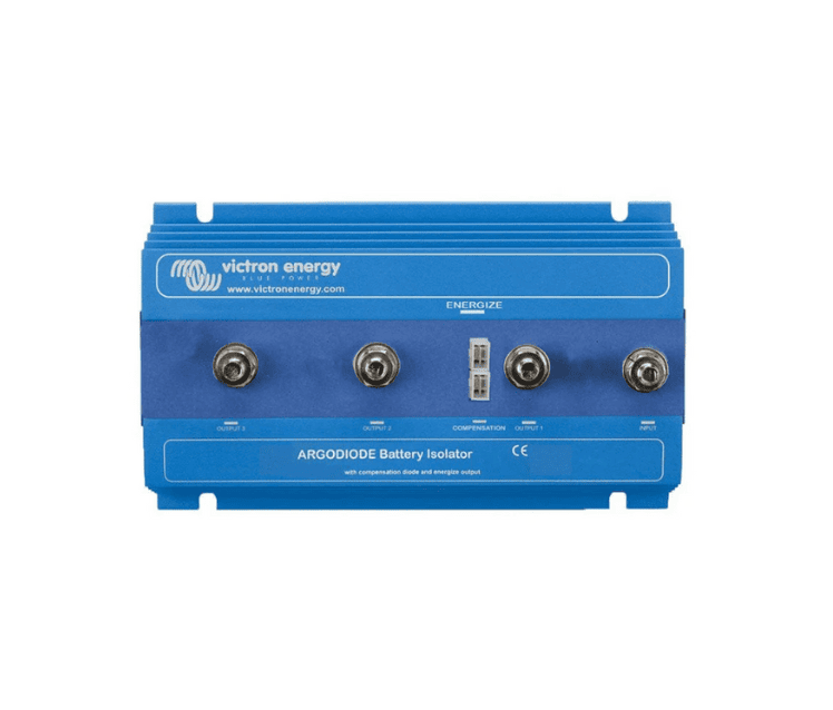Los puentes de diodos permiten cargar simultáneamente distintas baterías a partir de un único alternador, sin conectar las baterías entre sí. Incluso descargadas, las baterías permanecen aisladas; de este modo, la utilización de la batería de servicio, por ejemplo, no puede descargar la batería de arranque. Los puentes de diodos ARGO presentan una caída de tensión reducida gracias a la utilización de diodos Schottky: a baja intensidad, la pérdida será de aproximadamente 0,3 V, y a pleno rendimiento, de 0,45 V. Todos los modelos están equiPados con un diodo de compensación que permite aumentar ligeramente la tensión de salida del alternador para compensar la pérdida de tensión del puente de diodos. para mejores resultados, ver nuestros puentes de diodos ARGO FET sin caída de tensión. Entrada de alimentación del alternador. Algunos alternadores necesitan una tensión CC en la salida B+ para empezar a cargar. Obviamente, la CC estará presente cuando el alternador esté conectado directamente a la batería. Sin embargo, si se inserta un puente de diodos o un separador FET, se evitará cualquier retorno de tensión/corriente de las baterías a la salida B+, y el alternador no se activará. Los nuevos puentes de diodo “AC” disponen de una entrada especial con limitador de corriente que alimentará la salida B+ cuando el interruptor de arranque/parada del motor esté cerrado.