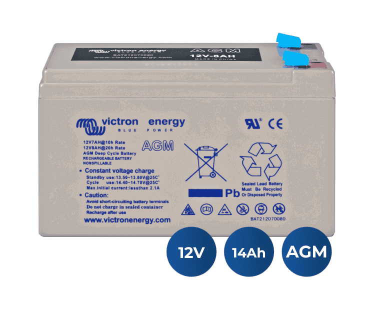 Victron BAT212120086 es una batería de cíclica de tecnología AGM, Sin mantenimiento para uso industrial y aplicaciones de flotación y tracción con una capacidad de 14Ah a 12V de tensión. Victron Energy es una marca holandesa referente mundial en desarrollo de baterías y productos relacionados con las energías verdes.Características:Batería con tecnología VRLA.VRLA son las siglas de Valve Regulated Lead Acid, lo que significa que la batería es hermética. Habrá escape de gas en las válvulas de seguridad únicamente en caso de sobrecarga o de algún fallo de los componentes.Las baterías VRLA no requieren ningún tipo de mantenimiento.Batería AGM estanca (VRLA).AGM son las siglas de Absorbent Glass Mat. En estas baterías, el electrólito se absorbe por capilaridad en una estera en fibra de vidrio situada entre las placas. Las baterías AGM resultan más adecuadas para suministrar corrientes muy elevadas durante períodos cortos (arranque) que las baterías de Gel.Autodescarga escasa.Gracias a la utilización de rejillas de plomo-calcio y materiales de gran pureza, las baterías VRLA Victron se pueden almacenar durante largo tiempo sin necesidad de recarga. El índice de autodescarga es inferior a un 2% al mes, a 20ºC. La autodescarga se duplica por cada 10ºC de aumento de temperatura. Con un ambiente fresco, las baterías VRLA de Victron se pueden almacenar durante un año sin tener que recargar.