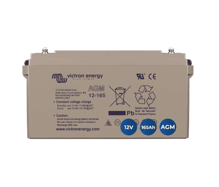 La gama AGM tiene una resistencia interna muy baja, por lo que son muy convenientes para usos que conllevan una alta intensidad de descarga, tales como inversores, propulsores y motores de arranque.Debido al uso de materiales de gran pureza y de rejillas de plomo-calcio, las baterías AGM y GEL tienen una autodescarga muy baja, lo que permite largos periodos de almacenamiento sin necesidad de carga.Ambas gamas tienen terminales de cobre plano con pernos M8, que garantizan el mejor contacto posible y eliminan la necesidad de bornes de batería. Fabricadas de acuerdo con la certificación ISO 9002, las baterías cumplen con las normativas CE y UL y sus recipientes son de ABS resistente al fuego. Disponen de una garantía de Victron Energy de dos años con cobertura en el mundo entero.Nuestras baterías Victron Energy AGM Deep Cycle (ciclo profundo) ofrecen excelentes resultados a alta intensidad y por ello se recomiendan para aplicaciones como el arranque de motores.Debido a su diseño, las baterías de gel tienen una capacidad real menor a alta intensidad. En cambio, las baterías de geltienen mejor duración de vida en modo flotación y ciclos AGM son las siglas de Absorbent Glass Mat. En estas baterías, el electrólito se absorbe por capilaridad en una estera en fibra de vidrio situada entre las placas. Tal como se explica en nuestro libro “Energía Sin Límites”, las baterías AGM resultan más adecuadas para suministrar corrientes muy elevadas durante períodos cortos (arranque) que las baterías de Gel.