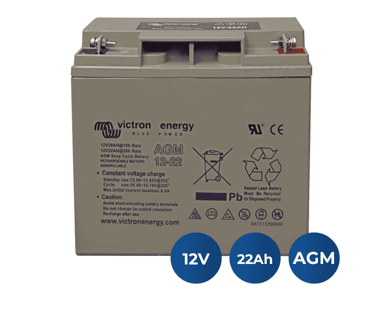 Victron BAT212200084 es una batería de cíclica de tecnología AGM, Sin mantenimiento para uso industrial y aplicaciones de flotación y tracción con una capacidad de 22Ah a 12V de tensión. Victron Energy es una marca holandesa referente mundial en desarrollo de baterías y productos relacionados con las energías verdes.