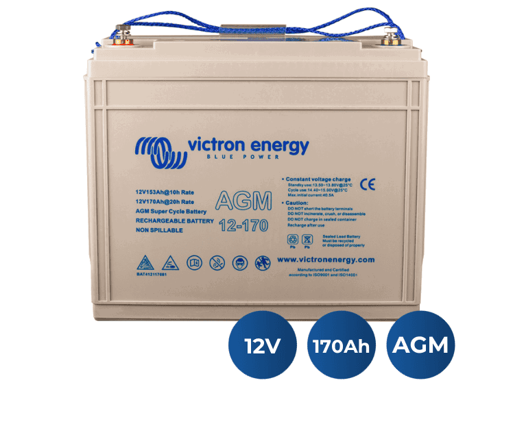 Batería AGM Super Cycle Victron Energy 12V 170Ah. Las baterías AGM Super Cycle son el resultado de los recientes avances en electroquímica en el campo de las baterías.La gama AGM tiene una resistencia interna muy baja, lo que las hace especialmente adecuadas para aplicaciones de descarga de alta corriente, como para inversores, propulsores y cabrestantes. VRLA AGM: vida útil 7-10 añosCaracterísticasUna batería realmente innovadoraLas baterías AGM Super Cycle son el resultado de los recientes desarrollos electroquímicos de las baterías.La pasta de las placas positivas es menos sensible al reblandecimiento, incluso en caso de descarga repetida del 100% de la batería, y los nuevos aditivos del electrolito reducen la sulfatación en caso de descarga profunda.Excepcional rendimiento de la profundidad de descarga del 100% (DoD)Las pruebas han demostrado que la batería Super Cycle resiste al menos trescientos ciclos de 100% DoD.Las pruebas consisten en una descarga diaria a 10,8V con I = 0,2C20, seguida de aproximadamente dos horas de descanso en condición de descarga, y luego una recarga con I = 0,2C20.El período de descanso de dos horas en condición de descarga dañará la mayoría de las baterías en 100 ciclos, pero no la batería Super Cycle.Recomendamos la batería Super Cycle para aplicaciones en las que se espera una descarga ocasional hasta el 100% de DoD, o una descarga frecuente hasta el 60-80% de DoD.Más pequeña y ligeraUna ventaja adicional de la nueva química es un tamaño ligeramente menor y menos peso en comparación con nuestras baterías AGM de ciclo profundo estándar.Baja resistencia internaLa resistencia interna también es ligeramente inferior a la de nuestras baterías AGM de ciclo profundo estándar.