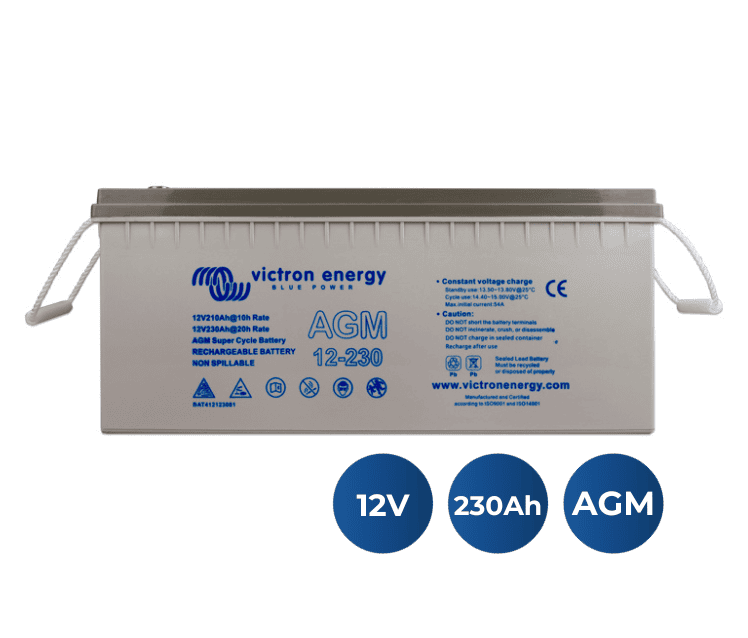 Batería Victron 12V/230Ah AGM Super Cycle BattUna batería realmente innovadoraLas baterías AGM Super Cycle, como la batería Victron 12V/230Ah AGM Super Cycle Batt, son el resultado de recientes avances de la electroquímica en el ámbito de las baterías.La pasta de las placas positivas es menos sensible al reblandecimiento, incluso en el caso de repetidas descargas completas de la batería. Y unos nuevos aditivos en el electrolito reducen la sulfatación en caso de descarga profunda.Excepcional rendimiento en profundidad de descarga (DoD) del 100%Los ensayos muestran que la batería Super Cycle de Victron puede soportar hasta trescientos ciclos de DoD del 100%.Los ensayos consisten en una descarga diaria a 10,8V con I = 0,2C₂₀, seguida de aproximadamente dos horas de reposo en condición de descarga, y a continuación una recarga con I = 0,2C₂₀.Los periodos de reposo de dos horas en condición de descarga producirían daños a la mayoría de las baterías tras unos 100 ciclos, no así a la batería Super Cycle.Recomendamos la batería Super Cycle para su uso en aplicaciones en las que se espera se produzcan unas DoD del 100%, o frecuentes DoD del 60-80%.Más ligeras y pequeñasUna ventaja adicional de la nueva electroquímica es que permite un tamaño más reducido y un menor peso en comparación con las baterías AGM estándar de ciclo profundo.Baja resistencia internaLa resistencia interna también es ligeramente inferior en comparación con nuestras baterías AGM estándar de ciclo profundo.Batería Victron 12V/230Ah AGM Super Cycle BattUna batería realmente innovadoraLas baterías AGM Super Cycle, como la batería Victron 12V/230Ah AGM Super Cycle Batt, son el resultado de recientes avances de la electroquímica en el ámbito de las baterías.La pasta de las placas positivas es menos sensible al reblandecimiento, incluso en el caso de repetidas descargas completas de la batería. Y unos nuevos aditivos en el electrolito reducen la sulfatación en caso de descarga profunda.Excepcional rendimiento en profundidad de descarga (DoD) del 100%Los ensayos muestran que la batería Super Cycle de Victron puede soportar hasta trescientos ciclos de DoD del 100%.Los ensayos consisten en una descarga diaria a 10,8V con I = 0,2C₂₀, seguida de aproximadamente dos horas de reposo en condición de descarga, y a continuación una recarga con I = 0,2C₂₀.Los periodos de reposo de dos horas en condición de descarga producirían daños a la mayoría de las baterías tras unos 100 ciclos, no así a la batería Super Cycle.Recomendamos la batería Super Cycle para su uso en aplicaciones en las que se espera se produzcan unas DoD del 100%, o frecuentes DoD del 60-80%.Más ligeras y pequeñasUna ventaja adicional de la nueva electroquímica es que permite un tamaño más reducido y un menor peso en comparación con las baterías AGM estándar de ciclo profundo.Baja resistencia internaLa resistencia interna también es ligeramente inferior en comparación con nuestras baterías AGM estándar de ciclo profundo.