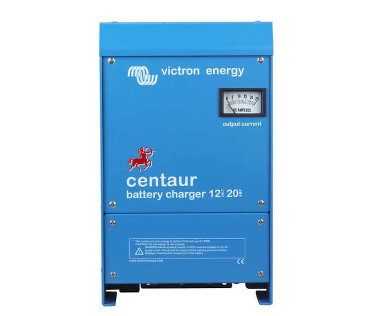 Los cargadores de batería Centaur son unos aparatos simples, robustos y económicos, pero que no dan ninguna concesión a nuestras normas de alta calidad y ofrecen los mejores resultados que permite la tecnología actual.Las cajas de aluminio con revestimiento epoxi y las fijaciones de acero inoxidable resisten a los ambientes con las condiciones más duras: calor, humedad y nieblas salinas. Los circuitos electrónicos están protegidos de la oxidación por medio de un barniz acrílico. Unos sensores de temperatura garantizan que todos los componentes funcionen dentro de los límites especificados, si es necesario mediante una disminución automática de la potencia de salida durante condiciones ambientales extremas.Características:Entrada universal de 90 a 265 voltiosLos cargadores Centaur aceptan una gama de tensión de alimentación muy amplia, de 90 a 265 voltios y de 45 a 65 hertzios, sin necesidad de ningún ajuste. De este modo, son compatibles con todos los voltajes y frecuencias corrientes, y pueden funcionar en redes de alimentación inestables.3 salidas de plena potenciaTres salidas aisladas permiten la carga simultánea de 3 conjuntos de baterías. Cada salida puede suministrar la potencia nominal de carga.Carga en 3 etapas con compensación de temperaturaEl Centaur carga a plena potencia hasta que la intensidad en salida alcanza el 70% de la potencia nominal, y a continuación mantiene un voltaje constante de absorción durante 4 horas. Seguidamente, el cargador pasa al modo de flotación. Un sensor de temperatura interno compensa el voltaje de carga de – 2 mV por ºC por elemento.Selector de voltajes de cargaUn conmutador interno permite seleccionar fácilmente los voltajes adaptados a los principales tipos de baterías (plomo-ácido, gel, AGM).Indicador de corriente de cargaUn amperímetro en el panel frontal permite conocer en todo momento el rendimiento del cargador hacia las baterías
