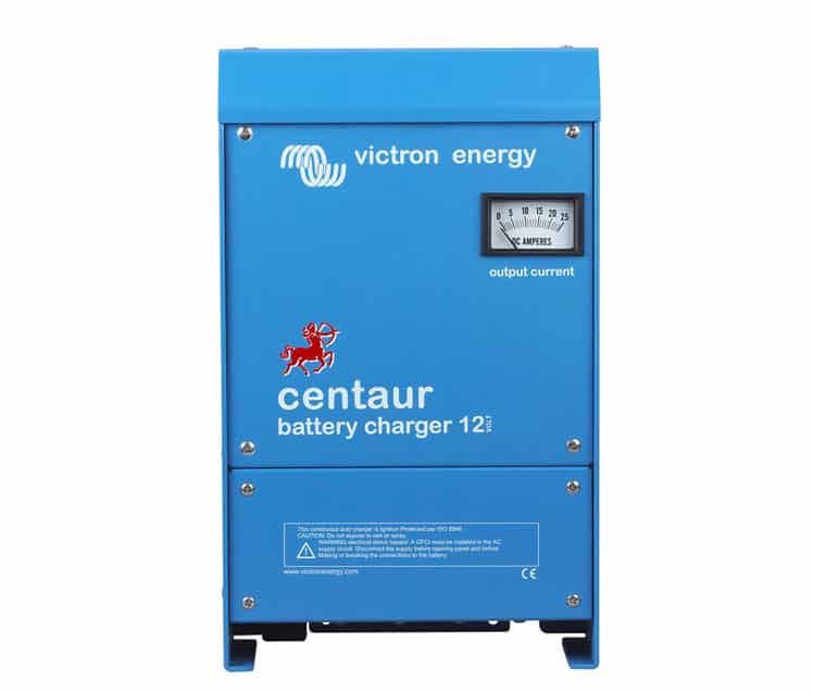 Los cargadores de batería Centaur son unos aparatos simples, robustos y económicos, pero que no dan ninguna concesión a nuestras normas de alta calidad y ofrecen los mejores resultados que permite la tecnología actual.Las cajas de aluminio con revestimiento epoxi y las fijaciones de acero inoxidable resisten a los ambientes con las condiciones más duras: calor, humedad y nieblas salinas. Los circuitos electrónicos están protegidos de la oxidación por medio de un barniz acrílico. Unos sensores de temperatura garantizan que todos los componentes funcionen dentro de los límites especificados, si es necesario mediante una disminución automática de la potencia de salida durante condiciones ambientales extremas.Características:Entrada universal de 90 a 265 voltiosLos cargadores Centaur aceptan una gama de tensión de alimentación muy amplia, de 90 a 265 voltios y de 45 a 65 hertzios, sin necesidad de ningún ajuste. De este modo, son compatibles con todos los voltajes y frecuencias corrientes, y pueden funcionar en redes de alimentación inestables.3 salidas de plena potenciaTres salidas aisladas permiten la carga simultánea de 3 conjuntos de baterías. Cada salida puede suministrar la potencia nominal de carga.Carga en 3 etapas con compensación de temperaturaEl Centaur carga a plena potencia hasta que la intensidad en salida alcanza el 70% de la potencia nominal, y a continuación mantiene un voltaje constante de absorción durante 4 horas. Seguidamente, el cargador pasa al modo de flotación. Un sensor de temperatura interno compensa el voltaje de carga de – 2 mV por ºC por elemento.Selector de voltajes de cargaUn conmutador interno permite seleccionar fácilmente los voltajes adaptados a los principales tipos de baterías (plomo-ácido, gel, AGM).Indicador de corriente de cargaUn amperímetro en el panel frontal permite conocer en todo momento el rendimiento del cargador hacia las baterías