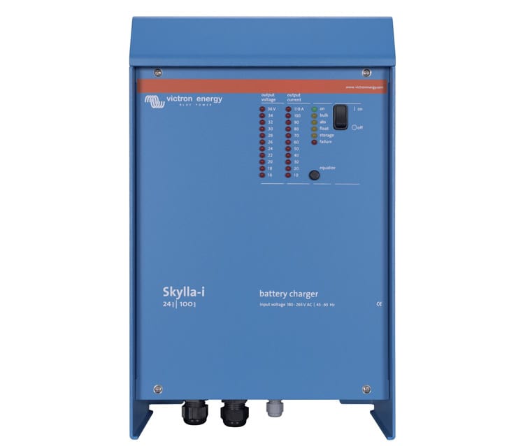 Un moderno y potente cargador de baterías que soporta los rigores de un entorno adverso: calor, humedad y aire salado.La cantidad de carga adecuada para una batería de plomo-ácido: tiempo de absorción variableModo BatterySafe: evita los daños debidos a un exceso de gasificaciónModo de almacenamiento: menos mantenimiento y envejecimiento cuando la batería no está en usoMás pequeño y ligero que otros modelos similaresConexión NMEA 2000 CanbusPowerControl: ajuste de la potencia máxima en tierraControl remotoPreparado para Li-ion (LiFePo4)Características:Skylla-i (3): tres salidas de corriente completa para cargar 3 bancos de bateríasEl Skylla-i (3) cuenta con 3 salidas aisladas. Todas las salidas pueden suministrar toda la corriente nominal de salida.ResistenteLas carcasas de aluminio con recubrimiento de polvo epoxi, con pantalla antigoteo y fijaciones de acero inoxidable, soportan los rigores de un entorno adverso: calor, humedad y aire salado. Las placas de circuito están protegidas con un revestimiento acrílico para una máxima resistencia a la corrosión. Los sensores de temperatura garantizan que los componentes de potencia funcionen siempre dentro de los límites especificados, si es necesario mediante la reducción automática de la corriente de salida en condiciones ambientales extremas.FlexibleAdemás de una interfaz de bus CAN (NMEA2000), se dispone de un interruptor giratorio, interruptores DIP y potenciómetros para adaptar el algoritmo de carga a una batería concreta y a sus condiciones de uso.Características importantes:Funcionamiento paralelo sincronizado Se pueden sincronizar varios cargadores con la interfaz de bus CAN. Esto se consigue simplemente interconectando los cargadores con cables RJ45 UTP. Consulte el manual para obtener más detalles.La cantidad correcta de carga para una batería de plomo: tiempo de absorción variableCuando sólo se producen descargas superficiales, el tiempo de absorción se mantiene corto para evitar la sobrecarga de la batería. Después de una descarga profunda, el tiempo de absorción aumenta automáticamente para garantizar que la batería se recargue completamente.Prevención de daños por exceso de gases: el modo BatterySafeSi, para cargar rápidamente una batería, se ha elegido una corriente de carga alta en combinación con una tensión de absorción alta, el Skylla-i evitará los daños debidos a un gaseo excesivo limitando automáticamente la tasa de aumento de tensión una vez que se haya alcanzado la tensión de gaseo.Menos mantenimiento y envejecimiento cuando la batería no está en uso: el modo de almacenamientoEl modo de almacenamiento se activa cuando la batería no se ha descargado durante 24 horas. En el modo de almacenamiento, la tensión de flotación se reduce a 2,2 V/celda (26,4 V para una batería de 24 V) para minimizar el gaseo y la corrosión de las placas positivas. Una vez a la semana, la tensión se eleva de nuevo al nivel de absorción para “refrescar” la batería. Esta característica evita la estratificación del electrolito y la sulfatación, una de las principales causas de fallo prematuro de la batería.Para aumentar la vida útil de la batería: compensación de temperaturaCada Skylla-i viene con un sensor de temperatura de la batería. Cuando se conecta, la tensión de carga disminuye automáticamente al aumentar la temperatura de la batería. Esta función se recomienda especialmente para las baterías de plomo-ácido selladas y/o cuando se esperan fluctuaciones importantes de la temperatura de la batería.Sentido de la tensión de la bateríaPara compensar las pérdidas de tensión debidas a la resistencia de los cables, el Skylla-i dispone de un sensor de tensión para que la batería reciba siempre la tensión de carga correcta.Adecuado para alimentación de CA y CC (funcionamiento de CA-CC y CC-CC)Los cargadores también aceptan una alimentación de CC.Uso como fuente de alimentaciónGracias a la tensión de salida perfectamente estabilizada, el Skylla-i puede utilizarse como fuente de alimentación si no se dispone de baterías o de grandes condensadores de amortiguación.Preparado para Li-Ion (LiFePO4)El control de encendido y apagado del cargador puede implementarse conectando una salida de relé o de optoacoplador de colector abierto de un BMS de Li-Ion al puerto de control remoto del cargador. Alternativamente, se puede lograr un control completo de la tensión y la corriente mediante la conexión al puerto de bus CAN aislado galvánicamente.