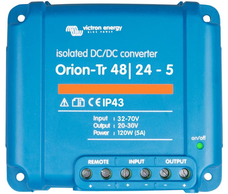 Victron Orion-TR, convertidor de CC a CC aislado 48/24-5 (120W). Con un convertidor de continua – continua se puede estabilizar la tensión continua procedente d