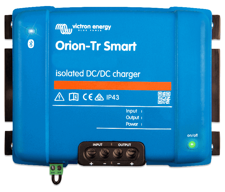 Cargador de CC/CC Victron Orion-TR Smart 24/12/20 (240W) con Bluetooth integrado. Carga dos bancadas de baterías no similares.Características:Bluetooth Smart habilitadoBluetooth integradoSe puede usar cualquier smartphone, tableta u otro tipo de dispositivo con Bluetooth para monitorizar, cambiar los ajustes y actualizar el cargador cuando haya nuevas funciones de software disponibles.Completamente programable- Algoritmo de carga de baterías (configurable) o salida fija.- Compatibilidad inteligente con el alternador: mecanismo de detección de motor en marcha.Algoritmo de carga adaptable de 3 etapas: carga inicial – absorción – flotación• En el caso de las baterías de plomo-ácido es importante que, si las descargas son leves, el tiempo de absorción sea corto para evitar sobrecargar la batería. Después de una descarga profunda, el tiempo de carga de absorción aumenta automáticamente para garantizar una recarga completa de la batería.• En el caso de las baterías de litio, el tiempo de absorción es fijo: 2 horas por defecto. • Alternativamente, se puede optar or una tensión de salida fija.On/Off remotoSe puede conectar un interruptor On/Off remoto a un conector bifásico. Alternativamente, el terminal H (derecha) del conector bifásico puede cambiarse al positivo de la batería, o el terminal L (izquierda) del conector bifásico puede cambiarse al negativo de la batería (o al chasis del vehículo, por ejemplo).Todos los modelos son a prueba de cortocircuitos y pueden conectarse en paralelo para incrementar la corriente de salida.Puede conectarse un número ilimitado de unidades en paralelo.Protección contra las altas temperaturas:La corriente de salida se reducirá cuando la temperatura ambiente sea alta.Protección IP43Si se instala con los bornes de tornillo orientados hacia abajo. Bornes de tornillo No se necesitan herramientas especiales para su instalaciónFusible de entrada (no reemplazable)
