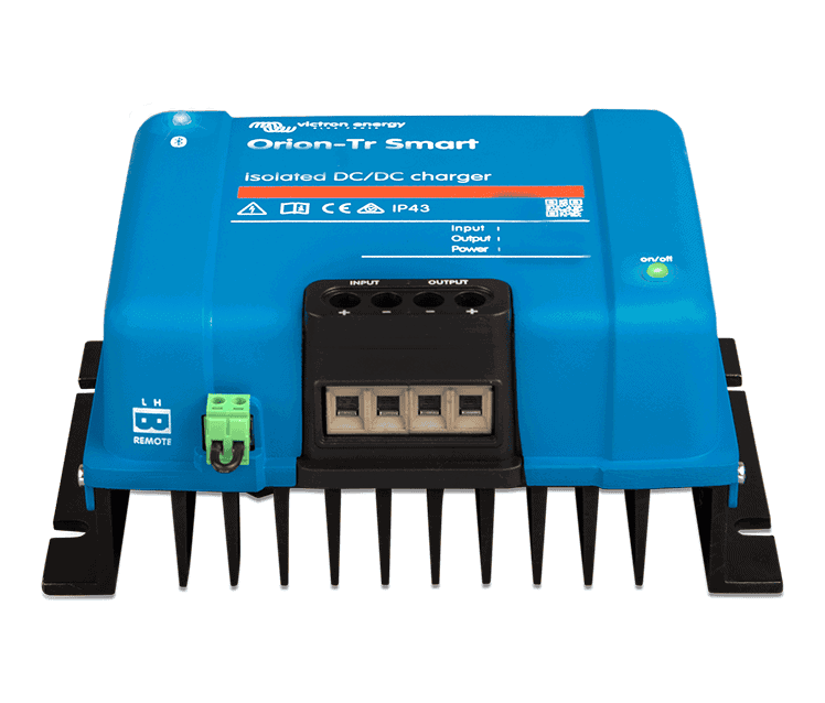 Cargador de CC/CC Victron Orion-TR Smart 24/12/30 (360W) con Bluetooth integrado. Carga dos bancadas de baterías no similares.Características:Bluetooth Smart habilitadoBluetooth integradoSe puede usar cualquier smartphone, tableta u otro tipo de dispositivo con Bluetooth para monitorizar, cambiar los ajustes y actualizar el cargador cuando haya nuevas funciones de software disponibles.Completamente programable- Algoritmo de carga de baterías (configurable) o salida fija.- Compatibilidad inteligente con el alternador: mecanismo de detección de motor en marcha.Algoritmo de carga adaptable de 3 etapas: carga inicial – absorción – flotación• En el caso de las baterías de plomo-ácido es importante que, si las descargas son leves, el tiempo de absorción sea corto para evitar sobrecargar la batería. Después de una descarga profunda, el tiempo de carga de absorción aumenta automáticamente para garantizar una recarga completa de la batería.• En el caso de las baterías de litio, el tiempo de absorción es fijo: 2 horas por defecto. • Alternativamente, se puede optar or una tensión de salida fija.On/Off remotoSe puede conectar un interruptor On/Off remoto a un conector bifásico. Alternativamente, el terminal H (derecha) del conector bifásico puede cambiarse al positivo de la batería, o el terminal L (izquierda) del conector bifásico puede cambiarse al negativo de la batería (o al chasis del vehículo, por ejemplo).Todos los modelos son a prueba de cortocircuitos y pueden conectarse en paralelo para incrementar la corriente de salida.Puede conectarse un número ilimitado de unidades en paralelo.Protección contra las altas temperaturas:La corriente de salida se reducirá cuando la temperatura ambiente sea alta.Protección IP43Si se instala con los bornes de tornillo orientados hacia abajo. Bornes de tornillo No se necesitan herramientas especiales para su instalaciónFusible de entrada (no reemplazable)
