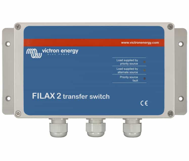 El Filax ha sido diseñado para conmutar cargas sensibles, como ordenadores o modernos equipos de entretenimiento, de una fuente de CA a otra. La fuente prioritaria suele ser la red eléctrica, un generador o la toma de tierra. La fuente alternativa suele ser un inversor. Con su tiempo de conmutación de menos de 20 milisegundos, las cargas sensibles seguirán funcionando sin interrupción. El Filax no está pensado para alimentar equipos domésticos de alta potencia, como lavadoras o motores eléctricos.Transferencia de transición abiertaEl Filax es un interruptor de transferencia de transición abierta (romper antes de hacer).El tiempo máximo de transferencia de carga es de 16 ms.La carga es alimentada normalmente por la fuente prioritaria, y se transfiere a la fuente alternativa si:La tensión de la fuente prioritaria cae por debajo del valor umbral.La frecuencia de la fuente prioritaria cae por debajo del valor de umbral de baja frecuencia, o aumenta por encima del valor de umbral de alta frecuencia.La transferencia inversa de la fuente alternativa a la fuente prioritaria se inicia cuando la fuente prioritaria ha operado dentro de los límites de conmutación inversa de tensión y frecuencia durante 30s.