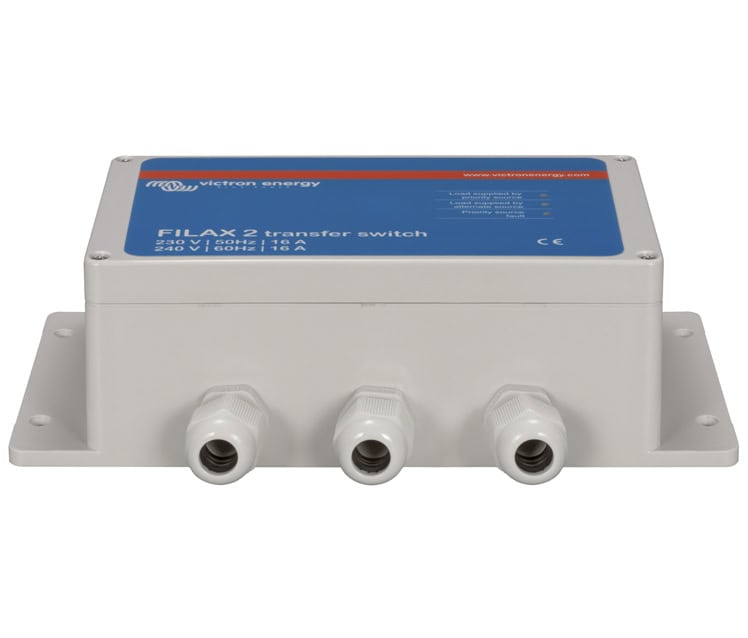 El Filax ha sido diseñado para cambiar cargas sensibles, como computadoras o equipos de entretenimiento modernos, de una fuente de CA a otra. La fuente prioritaria suele ser la red eléctrica, un generador o la energía de la costa. La fuente alternativa suele ser un inversor. Con su tiempo de conmutación de menos de 20 milisegundos, las cargas sensibles seguirán funcionando sin interrupciones. El Filax no está diseñado para alimentar equipos domésticos de alta potencia como lavadoras o motores eléctricos.Transferencia de transición abiertaEl Filax es un interruptor de transferencia de transición abierta (romper antes de hacer).El tiempo máximo de transferencia de carga es de 16ms.La carga normalmente es suministrada por la fuente prioritaria y se transfiere a la fuente alternativa si:El voltaje de la fuente prioritaria cae por debajo del valor umbral.La frecuencia de la fuente prioritaria cae por debajo del valor umbral de baja frecuencia o aumenta por encima del valor umbral de alta frecuencia.La transferencia inversa de la fuente alternativa a la fuente prioritaria se inicia cuando la fuente prioritaria ha operado dentro de los límites de conmutación inversa de voltaje y frecuencia durante 30 s.
