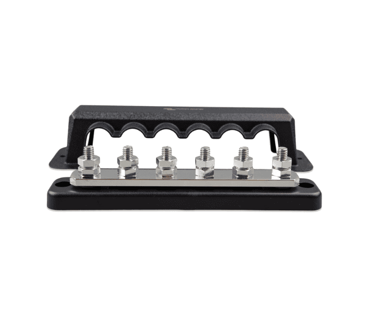 Se usan barras colectoras para la distribución de alta corriente que además proporcionan conexiones para baterías y/o equipo CC. Victron Energy ofrece diferente