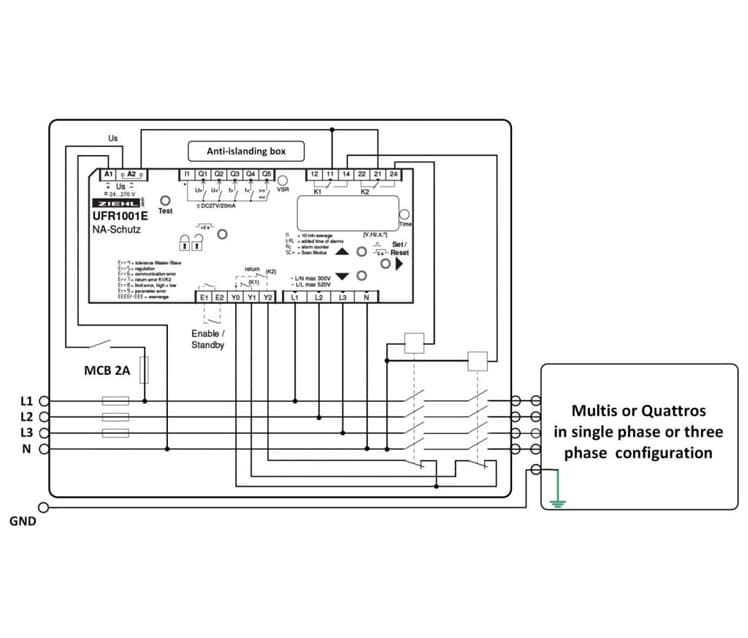 La caja anti-isla es un dispositivo anti-isla completo precableado y fácil de instalar que consta de un relé anti-isla Ziehl (modelo UFR1001E o modelo SPI1021),