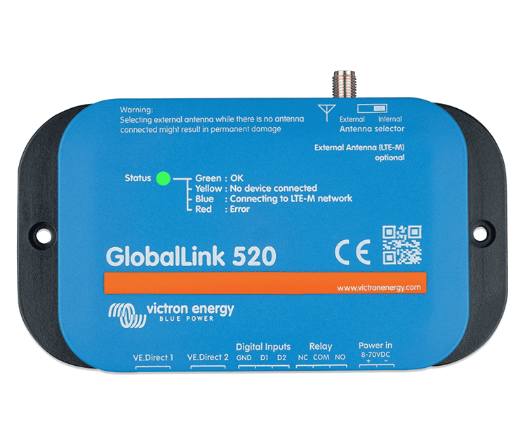 Victron cree que tener una visión de su instalación es un factor clave para el mantenimiento y el funcionamiento de sus soluciones energéticas sin conexión a la red. Sin conexión a la red no debería significar sin conexión, por lo que han creado el GlobalLink 520. Este dispositivo aportará conectividad 4G LTE-M a todos los dispositivos compatibles con VE.Direct sin necesidad de cuotas mensuales ni suscripciones, durante los primeros cinco años. CaracterísticasConectividad global con 4G LTE-MLTE-M es la abreviatura de LTE Cat-M1 o Long Term Evolution (4G), categoría M1. Esta tecnología celular está diseñada para conectar los dispositivos del Internet de las Cosas a las torres 4G existentes utilizando poca energía. LTE-M admite traspasos e itinerancia, por lo que es posible utilizar este dispositivo en un vehículo en movimiento, como una autocaravana. Consulta https://1nce.com/en/coverage/ para ver si se ha confirmado oficialmente que LTE-M está disponible en tu zona. La cobertura aumenta cada semana a medida que los proveedores locales van desplegando el soporte. Tu compra incluye 5 años de conectividad, por lo que no tienes que preocuparte de comprar un paquete de datos y una tarjeta SIM por separado.Fácil supervisión y control del sistemaSu GlobalLink 520 incluye dos puertos VE.Direct que le permiten conectar hasta dos dispositivos VE.Direct, como un monitor de baterías BMV y/o un controlador de carga solar MPPT, directamente al VRM. Con dos entradas digitales que también actúan como contadores de pulsos y un relé controlable a distancia, es una solución perfecta para supervisar y controlar su instalación.Antena incorporadaEl GlobalLink 520 viene con una antena incorporada que está diseñada para funcionar en todo el mundo. Sin embargo, si necesita una mejor recepción o quiere instalar su módulo en una furgoneta de servicios públicos, por ejemplo, también es posible montar una antena externa.Gestión remota de VictronEl portal online Victron Remote Management (VRM) le proporciona acceso a su instalación, desde cualquier lugar y en cualquier momento. En VRM puede comprobar el estado de sus productos conectados, ver gráficos históricos detallados de su energía, generar informes analíticos detallados e incluso alarmas automáticas en caso de que algo vaya mal.