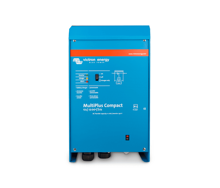 El inversor cargador MultiPlus reúne, en una sola carcasa compacta, un potente inversor sinusoidal, un sofisticado cargador de baterías con tecnología adaptable y un conmutador de transferencia de CA de alta velocidad. Los inversores cargadores Multiplus de Victron son compatibles con baterías Litio-Ion.Características:Dos salidas CA La salida principal dispone de la función “no-break” (sin interrupción). El MultiPlus se encarga del suministro a las cargas conectadas en caso de apagón o de desconexión de la red eléctrica/generador. La segunda salida sólo está activa cuando a una de las entradas del MultiPlus le llega alimentación CA. A esta salida se pueden conectar aparatos que no deberían descargar la batería, como un calentador de agua, por ejemplo (segunda salida disponible sólo en los modelos con conmutador de transferencia de 50A). Potencia prácticamente ilimitada gracias al funcionamiento en paralelo Hasta 6 Multis pueden funcionar en paralelo para alcanzar una mayor potencia de salida y de carga. Capacidad de funcionamiento trifásico Además de la conexión en paralelo, se pueden tres unidades del mismo modelo para una salida trifásica. Pero eso no es todo: se pueden conectar en paralelo hasta 6 juegos de tres unidades.PowerControl – Potencia limitada del generador, del pantalán o de la red El Multi es un cargador de baterías muy potente. Por lo tanto, usará mucha corriente del generador o de la red del pantalán (casi 10 A por cada Multi de 5kVA a 230 VCA). En el Panel Multi Control puede establecerse una corriente máxima proveniente del generador o del pantalán. El MultiPlus tendrá en cuenta las demás cargas CA y utilizará la corriente sobrante para la carga, evitando así sobrecargar el generador o la red del pantalán. PowerAssist – Aumento de la capacidad eléctrica del pantalán o del generador Esta función lleva el principio de PowerControl a otra dimensión. Permite que el MultiPlus complemente la capacidad de la fuente alternativa. Cuando se requiera un pico de potencia durante un corto espacio de tiempo, como pasa a menudo, MultiPlus compensará inmediatamente la posible falta de potencia de la corriente del pantalán o del generador con potencia de la batería.Cargador variable de cuatro etapas y carga de bancadas de baterías dobles La salida principal proporciona una potente carga al sistema de baterías por medio de un avanzado software de “carga variable”. El software ajusta con precisión el proceso automático de tres etapas adaptándose a las condiciones de la batería y añade una cuarta etapa para prolongados periodos de carga lenta. Además de lo anterior, el MultiPlus puede cargar una segunda batería.La configuración del sistema no puede ser más sencilla Una vez instalado, el MultiPlus está listo para funcionar. Si ha de cambiarse la configuración, se puede hacer en cuestión de minutos mediante un nuevo procedimiento de configuración del conmutador DIP, o a través del software de Victron.