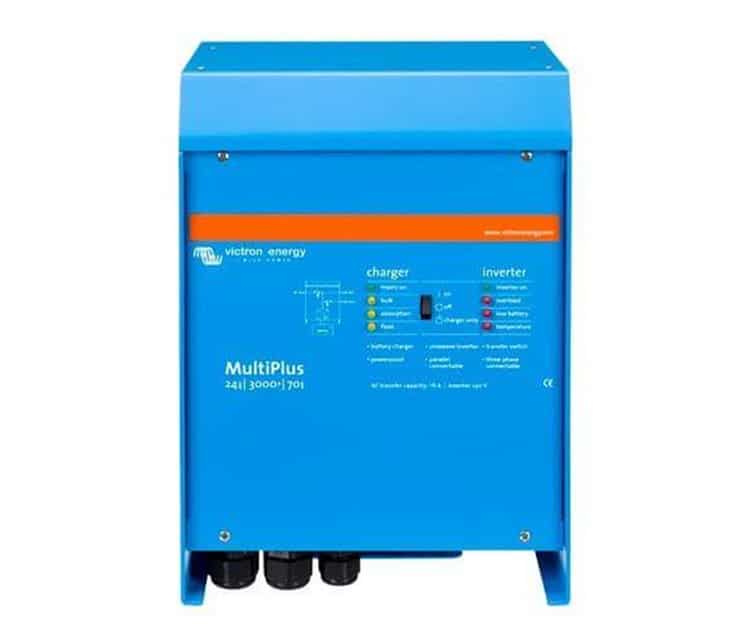 Potente Inversor-cargador de la familia Multiplus de la marca Victron, con potencia continua de salida de 3000VA y pico de potencia de hasta 6000W para soportar