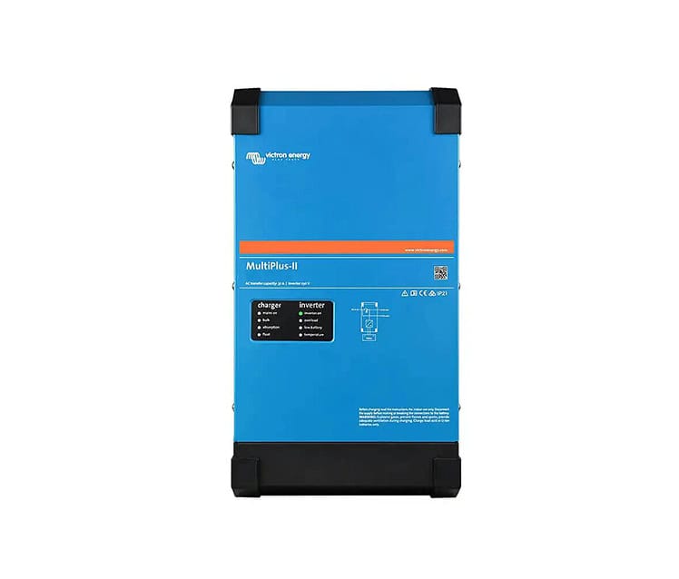 Un MultiPlus, con funcionalidad ESS (Sistema de almacenamiento de energía)El MultiPlus-II es un inversor/cargador multifuncional con todas las funciones del MultiPlus, más un sensor de corriente externa opcional que amplía las funciones PowerControl y PowerAssist hasta 50A y 100A respectivamente.El MultiPlus-II es ideal para su uso profesional en el ámbito marino, navegación de recreo, vehículos y aplicaciones terrestres no conectadas a la red.También dispone de una funcionalidad antiisla incorporada y homologaciones en cada vez países para su uso como ESS. Existen varias configuraciones del sistema posibles. Podrá encontrar información más detallada en el Manual de diseño y configuraciónde sistemas ESS.Un sistema de almacenamiento de energía (ESS) es un tipo específico de sistema de energía que integra una conexión a la red eléctrica con un inversor / cargador Victron, un dispositivo Venus y un sistema de batería. Almacena energía solar en su batería durante el día, para su uso posterior cuando el sol deja de brillar.PowerControl y PowerAssist – aumento de la capacidad de la red o de un generadorSe puede establecer una corriente máxima del generador o de la red. El MultiPlus-II tendrá en cuenta las demás cargas de CA y utilizará la corriente sobrante para cargar la batería, evitando así sobrecargar el generador o la red (función PowerControl).PowerAssist lleva el principio de PowerControl a otra dimensión. Cuando se requiera un pico de potencia durante un corto espacio de tiempo, como pasa a menudo, el MultiPlus-II compensará la falta de potencia del generador, de la toma de puerto o dela red con energía de la batería. Cuando se reduce la carga, la potencia sobrante se utiliza para recargar la batería.Energía solar: Energía CA disponible incluso durante un apagónEl MultiPlus II puede utilizarse en sistemas fotovoltaicos, conectados a la red eléctrica o no, y en otros sistemas de energía alternativos. Es compatible tanto con controladores de carga solar como con inversores conectados a la red. Dos salidas CALa salida principal dispone de la función “no-break” (sin interrupción). El MultiPlus II se encarga del suministro a las cargas conectadas en caso de apagón o de desconexión de la toma de puerto/generador. Esto ocurre tan rápidamente (menos de 20 milisegundos) que los ordenadores y demás equipos electrónicos continúan funcionando sin interrupción.La segunda salida sólo está activa cuando la entrada del MultiPlus II tiene alimentación CA. A esta salida se pueden conectar aparatos que no deberían descargar la batería, como un calentador de agua, por ejemplo.Potencia prácticamente ilimitada gracias al funcionamiento en paralelo y trifásico.Hasta 6 Multis pueden funcionar en paralelo para alcanzar una mayor potencia de salida. Seis unidades 48/5000/70, por ejemplo, darán una potencia de salida de 25 kW/30 kVA y una capacidad de carga de 420 amperios.Además de la conexión en paralelo, se pueden tres unidades del mismo modelo para una salida trifásica. Pero eso no es todo: se pueden conectar en paralelo hasta 6 juegos de tres unidades que proporcionarán una capacidad de inversor de 75kW / 90 kVA y más de 1200 amperios de capacidad de carga.Configuración, seguimiento y control del sistema in situLa configuración puede cambiarse en cuestión de minutos con el software VEConfigure (se necesita un ordenador o un portátil y una interfaz MK3-USB).Hay varias opciones de seguimiento y control disponibles: Color Control GX, Venus GX, Octo GX, CANvu GX, portátil, ordenador, bluetooth (con la mochila opcional VE.Bus Smart), monitor de baterías, panel Digital Multi Control.Configuración y seguimiento remotosInstale un Color Control GX u otro producto GX para conectarse a Internet.Los datos de funcionamiento se pueden almacenar y mostrar gratuitamente en la web VRM (Victron Remote Management).Una vez conectado a Internet, se puede acceder a los sistemas de forma remota y se puede cambiar la configuración.