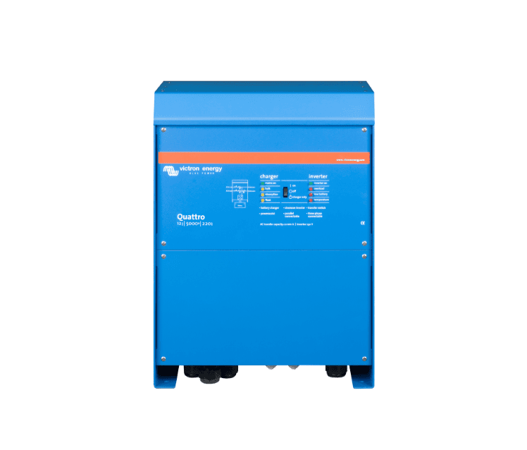 Al igual que el MultiPlus, el Quattro también es un aparato compuesto de un inversor y un cargador. Además, admite dos entradas CA y se conecta automáticamente a la entrada activa. Sus muchas características incluyen un inversor de onda sinusoidal pura, carga variable, tecnología PowerAssist híbrida, además de múltiples características para su integración en distintos sistemas, como sistemas trifásicos o de fase dividida.