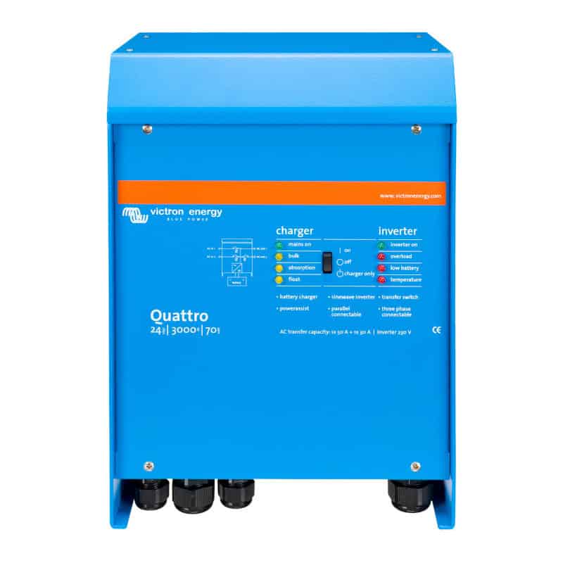El inversor cargador Quatro de Victron de 24v y 3000 VA de potencia dispone de dos entradas CA. Entre sus muchas características destaca el inversor de onda sin