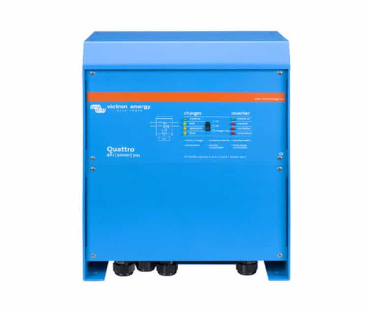Este cargador inversor tiene dos entradas de CA y dos salidas de CA. Su interruptor de transferencia integrado se conectará automáticamente a la fuente activa. La salida tiene una funcionalidad de UPS y el Quattro puede hacerse cargo del suministro de energía a las cargas tan rápidamente que las computadoras y otros equipos ya no se interrumpen. Sus muchas características incluyen un verdadero inversor de onda sinusoidal, carga adaptativa, tecnología híbrida PowerAssist más características de integración de múltiples sistemas, como operación trifásica o dividida y operación en paralelo. Al ser un modelo de 48 voltios CC, es más compacto que los modelos comparables de 12 y 24 voltios.