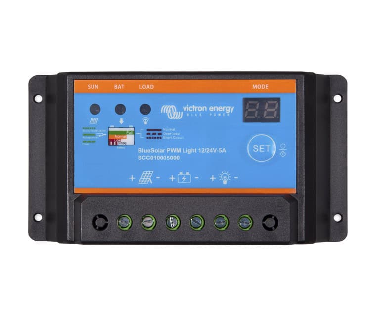 BlueSolar 12/24-PWM. Tres modelos: 5 A, 10 A o 20 A a 12 V o 24 V• Controlador PWM de bajo coste.• Sensor de temperatura interna.• Carga de las baterías de tres etapas (inicial, absorción y flotación).• Protegido contra sobre corriente.• Protegido contra cortocircuitos.• Protegido contra la polaridad inversa de los paneles solares y/o de la batería.• Desconexión de la salida de carga por baja tensión.• Pantalla remota opcional (sólo modelos de 20A). BlueSolar 12/24-10 con temporizador 10 A a 12 V o 24 V• Pirheliómetro PWM (controlador de la luz solar directa).• Dos temporizadores para un funcionamiento desde el crepúsculo al amanecer, o para limitar el tiempo de funcionamiento después del crepúsculo y antes del amanecer.• Pantalla con siete segmentos para visualizar los ajustes de temporizador y analizar las condiciones de error.• Indicador del estado de la batería con alarma de sobre descarga.• Sensor de temperatura interna.• Carga de las baterías de tres etapas (inicial, absorción y flotación).• Protegido contra sobre corriente.• Protegido contra cortocircuitos.• Protegido contra la polaridad inversa de los paneles solares y/o de la batería.• Anulador de desconexión de carga por baja tensión Vea también nuestros nuevos modelos PWM-Pro.