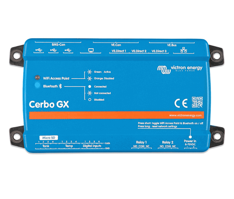 Una versión mejorada del Cerbo GX. Ahora con dos puertos de bus CAN totalmente funcionales, tomas RJ-45 giradas 180 grados para facilitar la extracción de cables, tres puertos USB totalmente funcionales y recuento de impulsos de entrada digital.