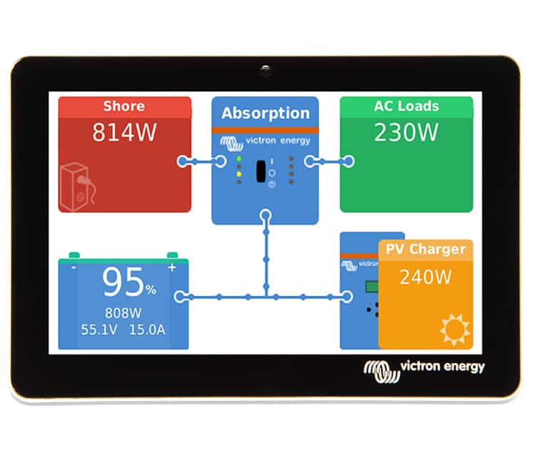 GX TOUCH 50 es la pantalla accesorio de la monitorización CERBO GX. Con ella podrás tener una visión general e instantánea del sistema solar fotovoltaico y ajus