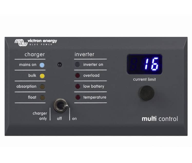 El Digital Multi Control se utiliza para consultar y ajustar de forma remota las corrientes CA de entrada y para encender o apagar los Multis o Quattros. Ha sido diseñado para integrarse limpiamente en el panel de control de su sistema instalado en su barco, en su vehículo o en su hogar.El panel DMC (Digital Multi Control) se ha concebido para interactuar con todos los Multis o Quattros. Esto incluye las configuraciones autónoma, paralela, bifásica y trifásica. Conectar el DMC a sus sistemas es sencillo: en la mayoría de los casos será suficiente conectar el DMC a su sistema con un cable RJ45, siendo innecesaria configuración adicional alguna.
