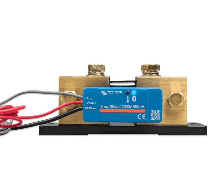 El derivador de baterías inteligenteEl SmartShunt es un monitor de batería todo en uno pero sin pantalla. Utiliza la pantalla de su teléfono. El SmartShunt se conecta mediante Bluetooth a la aplicación VictronConnect en su teléfono (o tableta) para que pueda leer cómodamente todos los parámetros controlados de su batería, como estado de carga, autonomía restante, datos históricos y mucho más.También puede conectarse y leerse con un dispositivo GX. La conexión al SmartShunt se hace con un cable VE.Direct.El SmartShunt es una buena alternativa al monitor de baterías BMV, especialmente en sistemas en los que se necesita hacer un seguimiento de la batería pero no se quiere tener tantos cables. El SmartShunt dispone de Bluetooth, un puerto VE.Direct y una conexión que puede usarse para: controlar una segunda batería, hacer seguimiento del punto medio o conectar un sensor de temperatura.