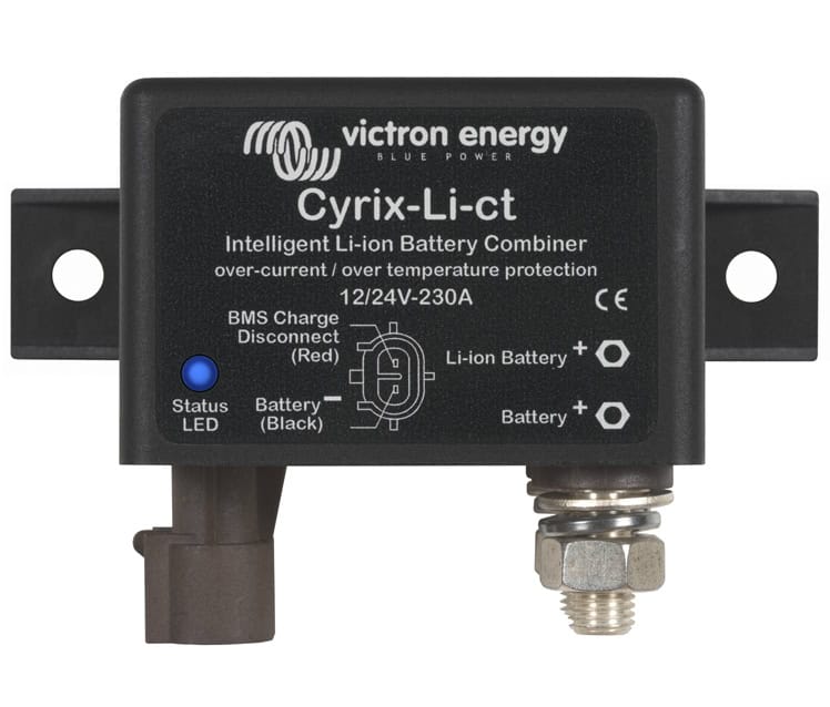 El combinador de baterías Cyrix-Li-Ct de Victron conectará en parelelo una batería de plomo ácido de arranque con una batería de litio LiFePO4, protegiendo a la