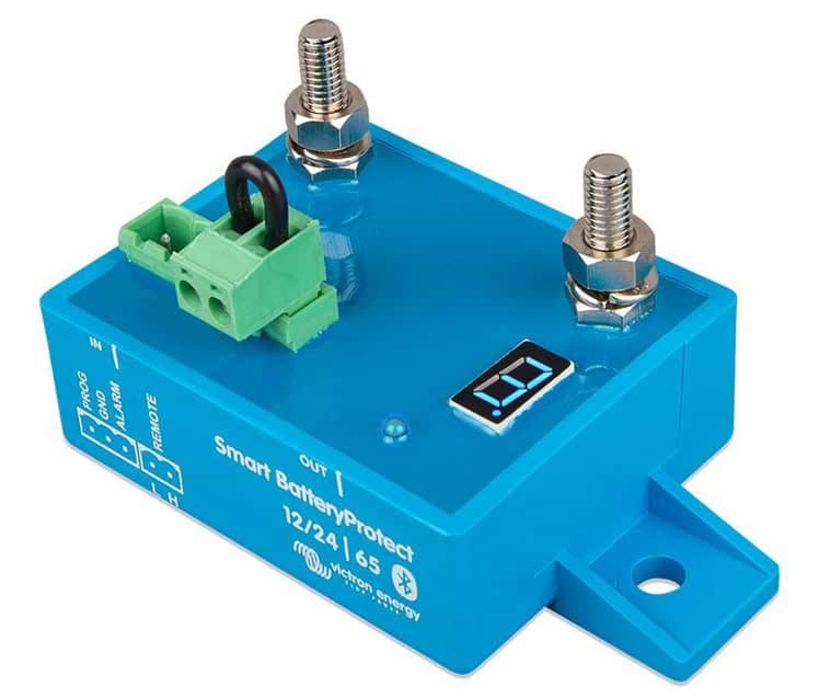 El Smart BatteryProtect desconecta las cargas no esenciales de la batería antes de que se descargue completamente (lo que dañaría la batería) o antes de que se quede sin energía suficiente como para arrancar el motor. Cuando se usa Bluetooth para programar el Smart BatteryProtect, se pueden fijar los niveles de conexión/desconexión necesarios. O se puede establecer uno de los nueve niveles de conexión/desconexión predeterminados con el pin de programación (véase el manual). Si fuera necesario, el Bluetooth puede desactivarse.Características:Protege la batería de las descargas excesivas y puede usarse como interruptor de encendido/apagado del sistemaEl Smart BatteryProtect desconecta las cargas no esenciales de la batería antes de que se descargue completamente (lo que dañaría la batería) o antes de que se quede sin la carga suficiente como para arrancar el motor.La entrada de encendido/apagado puede usarse como interruptor de encendido/apagado del sistema.12/24V autorreguladoEl Smart BatteryProtect detecta, automáticamente y sólo una vez, la tensión del sistema.Bluetooth: programación sencillaAl programar el Smart BatteryProtect mediante Bluetooth se pueden definir los niveles deseados de activación/desactivación.Alternativamente, con el pin de programación se puede definir uno de los nueve niveles de activación/desactivación (ver manual).Si fuese necesario, el Bluetooth puede deshabilitarse.Una configuración especial para las baterías Li-IonEn este modo, el BatteryProtect puede controlarse mediante el VE.Bus BMS.Nota: el BatteryProtect también puede utilizarse como interruptor de carga entre un cargador de batería y una bateríaLi-ion. Ver el diagrama de conexiones en el manual.Consumo de corriente ultra bajoEsto es importante en el caso de las baterías Li-Ion, especialmente después de una desconexión por baja tensión.Consulte la ficha técnica de la batería de Li-Ion y el manual del BMS del VE.Bus para obtener más información.Protección de sobretensiónPara evitar daños en las cargas sensibles debido a la sobretensión, la carga se desconecta cuando la tensión CC supera los 16,3V o 32,6V respectivamente.A prueba de incendiosSin relés pero con conmutadores MOSFET, por tanto, sin chispas.Salida de alarma retardadaLa salida de alarma se activa si la tensión de la batería cae por debajo del nivel de desconexión preconfigurado durante más de 12 segundos. Por tanto, al arrancar el motor no se activará la alarma. La salida de alarma es una salida en colector abierto a prueba de cortocircuitos al raíl negativo (menos), con una corriente máxima de 50 mA. Normalmente, la salida de alarma se utiliza para activar una señal acústica, un LED o un relé.Desconexión y reconexión demorada de la cargaLa carga se desconectará 90 segundos después de que la tensión de la batería caiga por debajo del nivel predeterminado. Si la tensión de la batería se incrementa de nuevo hacia el umbral de conexión en este periodo de tiempo (después de que, por ejemplo, el motor se haya arrancado), la carga no se desconectará.La carga se volverá a conectar 30 segundos después de que la tensión de la batería haya subido por encima del nivel de reconexión predeterminado.