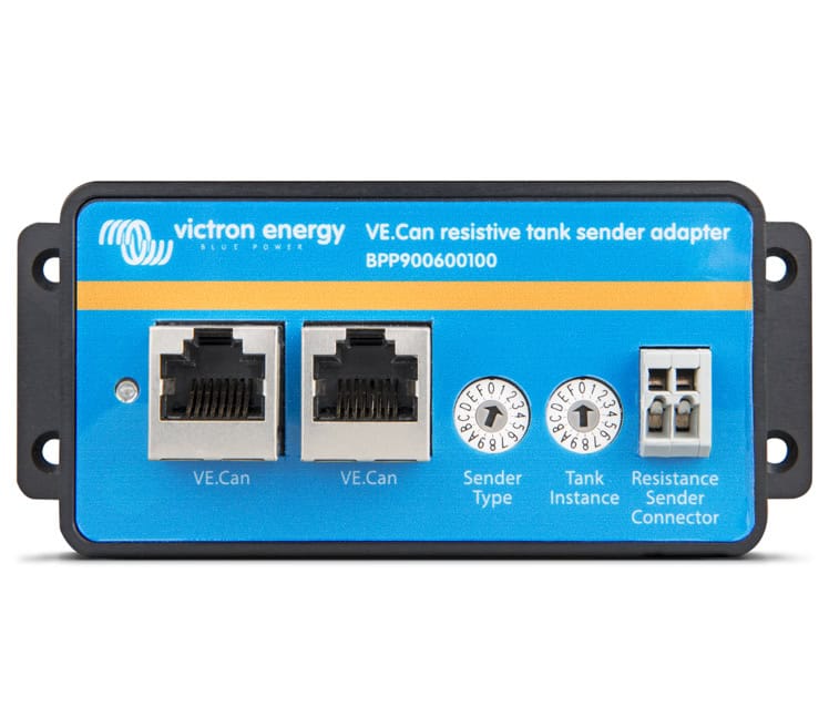 El adaptador de remitente de tanque resistivo VE.Can permite que un remitente de nivel de tanque resistivo estándar se conecte al Control de color GX. Es fácilmente configurable para remitentes resistivos de combustible, agua dulce, aguas residuales, agua pozo, aceite y depósitos de agua negra (aguas residuales). Soporta hasta 16 tanques de cada tipo. La unidad es una configuración sencilla con dos pequeños interruptores giratorios y obtiene su potencia de la red VE.Can. Fabricado en el Reino Unido.