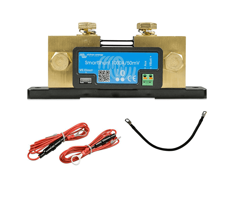 El SmartShunt 1000A / 50mV es un monitor de batería todo en uno, solo que sin pantalla. Su teléfono actúa como una pantalla. SmartShunt se conecta a la aplicación VictronConnect en su teléfono (o tableta) a través de Bluetooth y puede leer cómodamente todos los parámetros de la batería monitoreados, como el estado de carga, el tiempo restante, la información del historial y mucho más. Alternativamente, SmartShunt se puede conectar y leer mediante un dispositivo GX. La conexión al SmartShunt se realiza mediante un cable VE.Direct. SmartShunt es una excelente alternativa para el monitoreo de baterías BMV, especialmente para sistemas donde se requiere monitoreo de batería pero se desea menos cableado y desorden. El SmartShunt está equipado con Bluetooth, un puerto VE.Direct y una conexión que se puede utilizar para lo siguiente: monitoreo de una segunda batería, monitoreo de punto medio o un sensor de temperatura. El SmartShunt está disponible en las variantes 500Am 1000A y 2000A. El SmartShunt es un monitor de batería todo en uno, solo que sin pantalla. Su teléfono actúa como pantalla. SmartShunt se conecta a través de Bluetooth a la aplicación VictronConnect en su teléfono (o tableta) y puede leer cómodamente todos los parámetros de la batería monitoreados, como el estado de carga, tiempo restante, información histórica y mucho más. Alternativamente, SmartShunt se puede conectar y leer mediante un dispositivo GX. La conexión al SmartShunt se realiza mediante un cable VE.Direct. El SmartShunt es una buena alternativa para un monitor de batería BMV, especialmente para sistemas donde se necesita el control de la batería pero se desea menos cableado y desorden. El SmartShunt está equipado con Bluetooth, un puerto VE.Direct y una conexión que se puede utilizar para: monitorear una segunda batería, monitoreo de punto medio o un sensor de temperatura.
