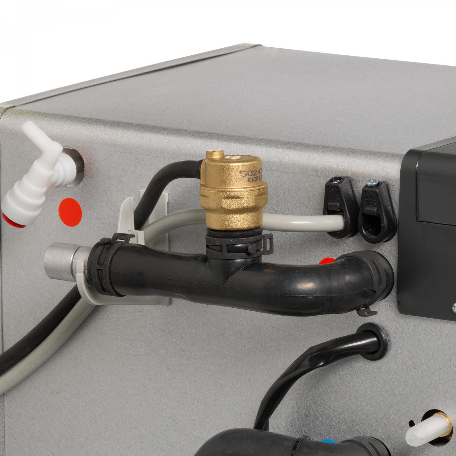 Conexión de goma con purga automática y válvula antirretorno para evitar la autocirculación en el sistema de calefacción. Manguera de desagüe de 1 m. Se instala en la conexión de salida de la caldera.