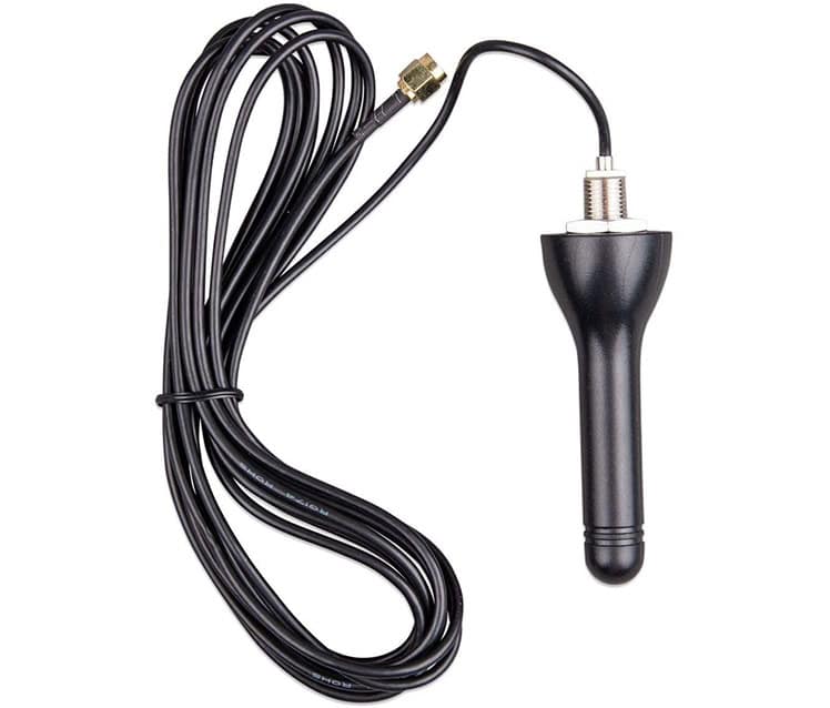La antena exterior 2G 3G GSM de Victron Energy (MPN GSM900100100) se puede utilizar con el módem GX GSM como reemplazo de la antena GSM interior del módem. La antena exterior ofrece una mejor recepción que la antena GX GSM suministrada de serie y también ha sido diseñada para uso exterior.